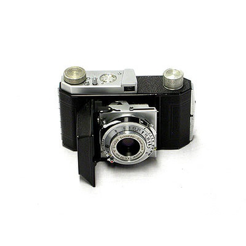 The Brownie Hawkeye was a basic 35mm camera produced by Kodak during a short run from 1949 to 1951. Designed for the casual snapshot market, it was constructed from durable Bakelite plastic and featured a simple fixed-focus lens and one shutter speed. As a point-and-shoot device, it offered minimal controls, primarily a viewfinder and a film advance knob, making photography accessible to the general public without requiring technical expertise. Its primary purpose was straightforward picture-taking in everyday situations, prioritizing ease of use over performance or features.