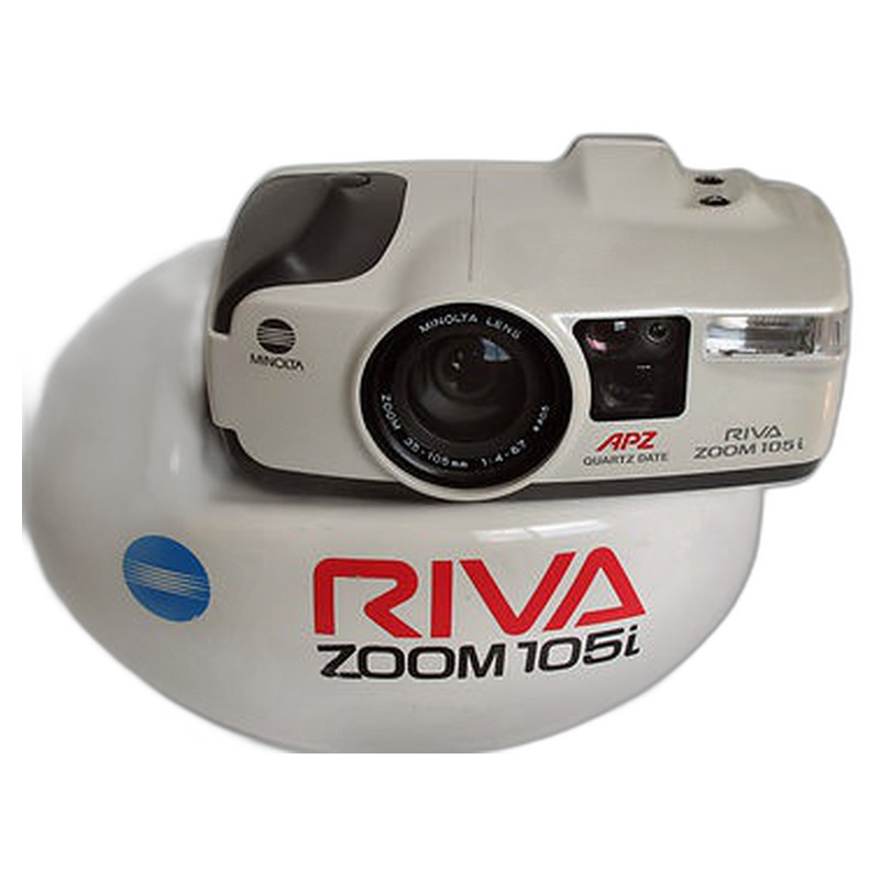 The Minolta Riva Zoom 105i Date is a compact 35mm point-and-shoot camera introduced in 1990, representing Minolta's approach to the accessible, consumer zoom market. It features a 38-105mm zoom lens, allowing for versatile framing of subjects from wide-angle to moderate telephoto perspectives, typical for its era. The "Date" model included a feature to imprint the date or time directly onto the photograph, a common functional addition for casual users seeking simple documentation. Designed for everyday photography with fully automatic operation, it embodies the straightforward, user-friendly design philosophy prevalent in entry-level cameras of the early 1990s.