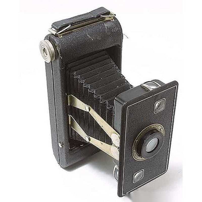 The Kodak Junior Six-16 Series II was a basic, entry-level 35mm camera produced by Kodak from 1937 to 1940. It represented Kodak's push to make the 35mm format more accessible to the average consumer, moving away from its earlier bulkier film types like 616. Featuring a simple fixed lens and straightforward shutter speeds, the camera was designed for ease of use and affordability, aiming at the amateur market seeking a compact option for snapshots without the complexity or cost of higher-end models. Its design was functional and unremarkable, prioritizing reliability and low price over advanced features or elegant aesthetics, firmly placing it within the category of ordinary consumer cameras of its era.