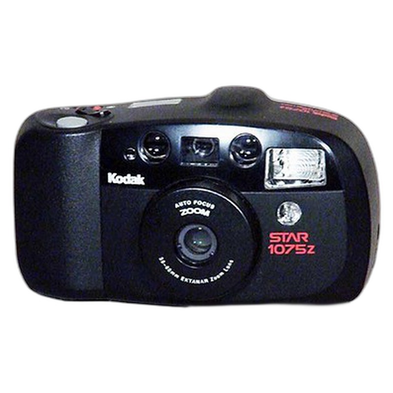 The Kodak Star 1075z appears to be a simple, fixed-focus or basic autofocus point-and-shoot camera likely produced during the 1980s or 1990s, representing the type of entry-level camera Kodak mass-produced for the snapshot market. Designed for ease of use, it probably featured a simple shutter system, minimal controls (likely just a shutter button and film advance), and used common 35mm film. Characterized by its straightforward plastic construction and functionality focused on capturing casual moments without technical complexity, the Star 1075z embodies Kodak's strategy of making photography accessible to the masses during the rise of film-based point-and-shoots.
