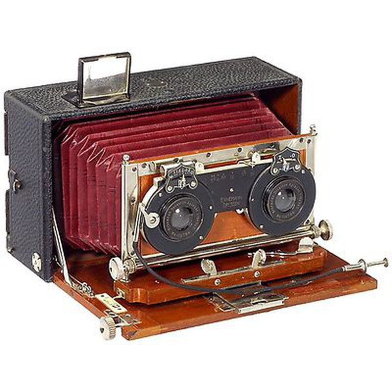The HEAG III Stereo by Ernemann represents a specialized stereo camera from the German manufacturer's product line during the early 20th century. Ernemann, founded in 1889, was a respected camera company known for quality optical instruments and innovative designs before merging with Zeiss-Ikon in 1926. The HEAG III Stereo was part of Ernemann's exploration of stereo photography, a popular medium for creating three-dimensional images through paired lenses. This camera likely featured a dual-lens system with synchronized shutters to capture nearly simultaneous images from slightly different perspectives, designed for viewing through a specialized stereoscope. The construction would have reflected Ernemann's engineering standards with sturdy materials typical of German cameras of the era, though specific details about its exact features or innovations remain undocumented.