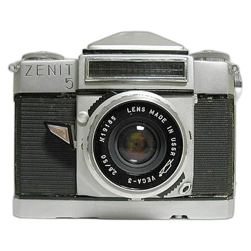 The Zenit 5, a 35mm single-lens reflex camera produced by the Soviet manufacturer KMZ in the late 1960s, exemplifies the utilitarian approach of mid-century Eastern Bloc camera design. It shares the sturdy, functional architecture typical of Zenit models, featuring a cloth focal-plane shutter with speeds up to 1/500s and an uncoupled selenium cell light meter mounted on the front plate. Built around a simple pentaprism viewfinder and equipped with a standard M42 screw mount, the camera prioritized accessibility over innovation, offering reliable performance for everyday photographers at an affordable price point. Its minimalistic design, including a Bakelite body with modest ergonomic controls, reflects the era's focus on accessibility over luxury, making it a representative example of Soviet consumer-grade optics technology.