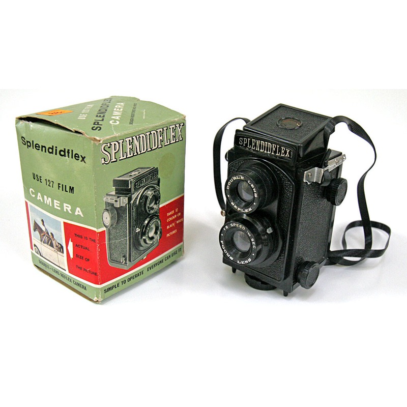 The Splendidflex represents a typical consumer-grade twin lens reflex camera utilizing the once-popular 127 rollfilm format. Marketed during the mid-20th century era when 127 cameras were common, this TLR provided users with the convenient waist-level viewing and fixed focal length shooting characteristic of the design. As a product of Splendidflex, a name not associated with significant photographic innovation, the camera likely served as a straightforward, affordable option for amateur photographers seeking an alternative to more complex or prestigious models from brands like Kodak or Rollei.